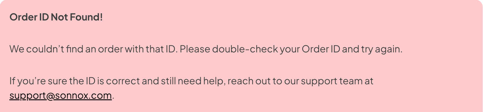 • Ensure you’re entering the Order ID from a Sonnox order, not from a reseller or another platform.