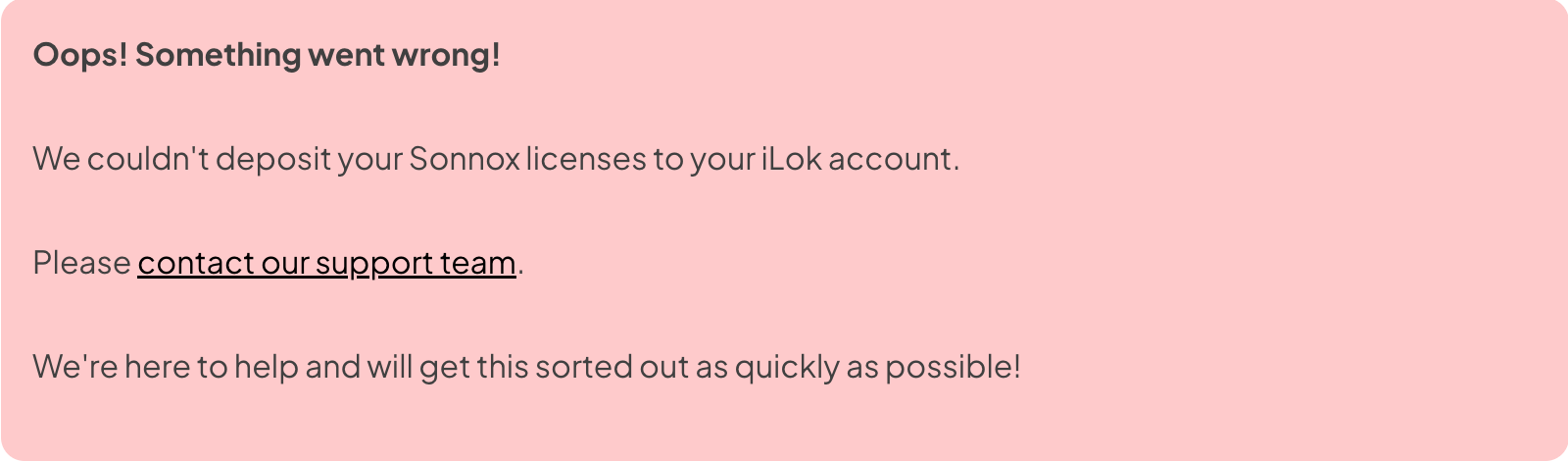 If you see an iLok-related error message while completing your Sonnox order or licence deposit, it usually indicates an issue with the account details or order information provided.